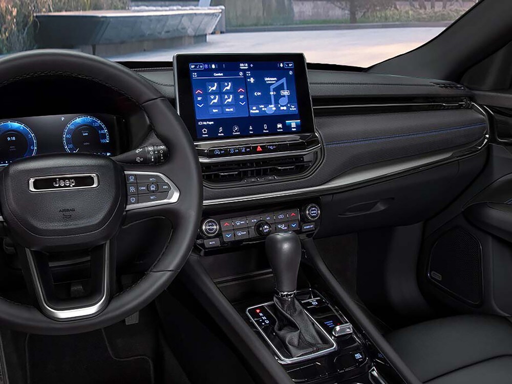 - Latitude Altitude: This new Jeep Compass trim level is the base model. Key features include Uconnect® 5 with a high-definition 10.1-inch touchscreen, wireless Apple CarPlay®, wireless Android Auto™, 18-inch gloss black wheels, a heated steering wheel, and premium cloth and vinyl heated front seats.